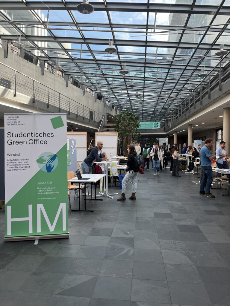 Am 21.10.2025 fand an der Hochschule München erstmals die Sustainability Fair – eine Nachhaltigkeitsmesse, organisiert durch das studentische Green Office – statt. Vertreten waren zahlreiche Ausstellende: von hochschulinternen Gruppierungen bis hin zu Vereinen wie dem Bund Naturschutz oder Greenpeace.