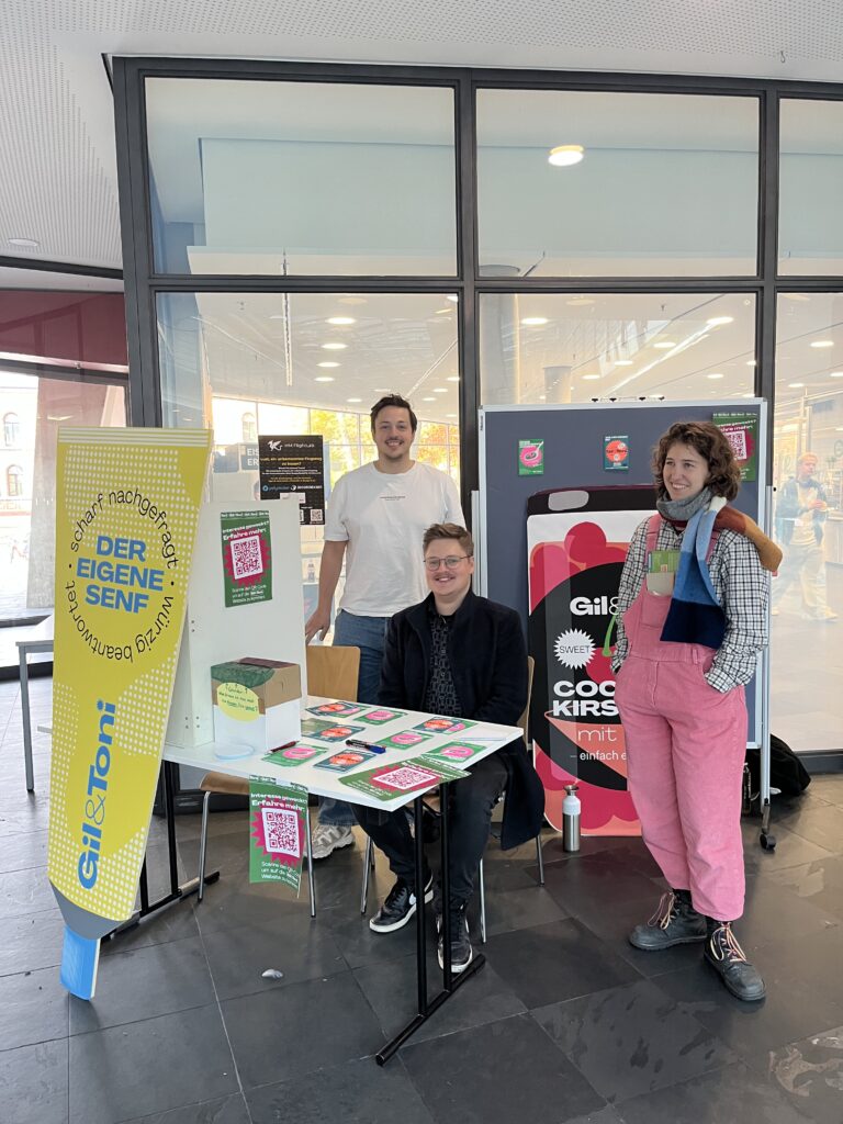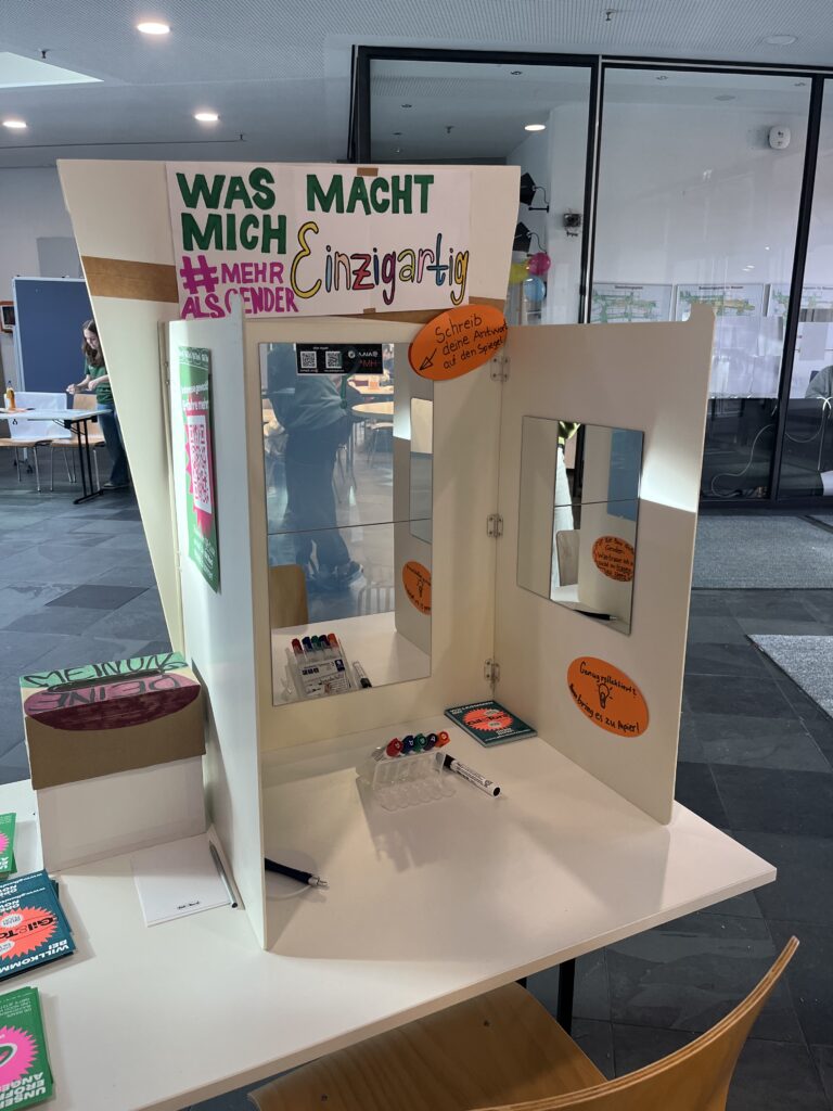Genau diese Relevanz von Geschlechteraspekten im Rahmen nachhaltiger Entwicklung haben Gil&Toni auf der Sustainability Fair vertreten: Mit tatkräftiger Unterstützung unseres studentischen Teams sind wir hier mit Euch ins Gespräch gekommen, haben nachgefragt, welche Rolle Gleichstellung in Euren Studienrichtungen spielt und welche nachhaltigen Veränderungen Ihr Euch dort wünscht. Außerdem haben wir an unserem Stand unsere bunten Postkarten verteilt und die Besuchenden dazu eingeladen, unsere Einzigartigkeits-Station zu nutzen. Darüber hinaus gab es die Möglichkeit, uns anonym Fragen zum Thema Gender in unsere Meinungsbox einzuwerfen. Diese werden wir nun zeitnah auswerten, um zukünftig noch gezielter auf Eure Wünsche und Bedarfe eingehen zu können.